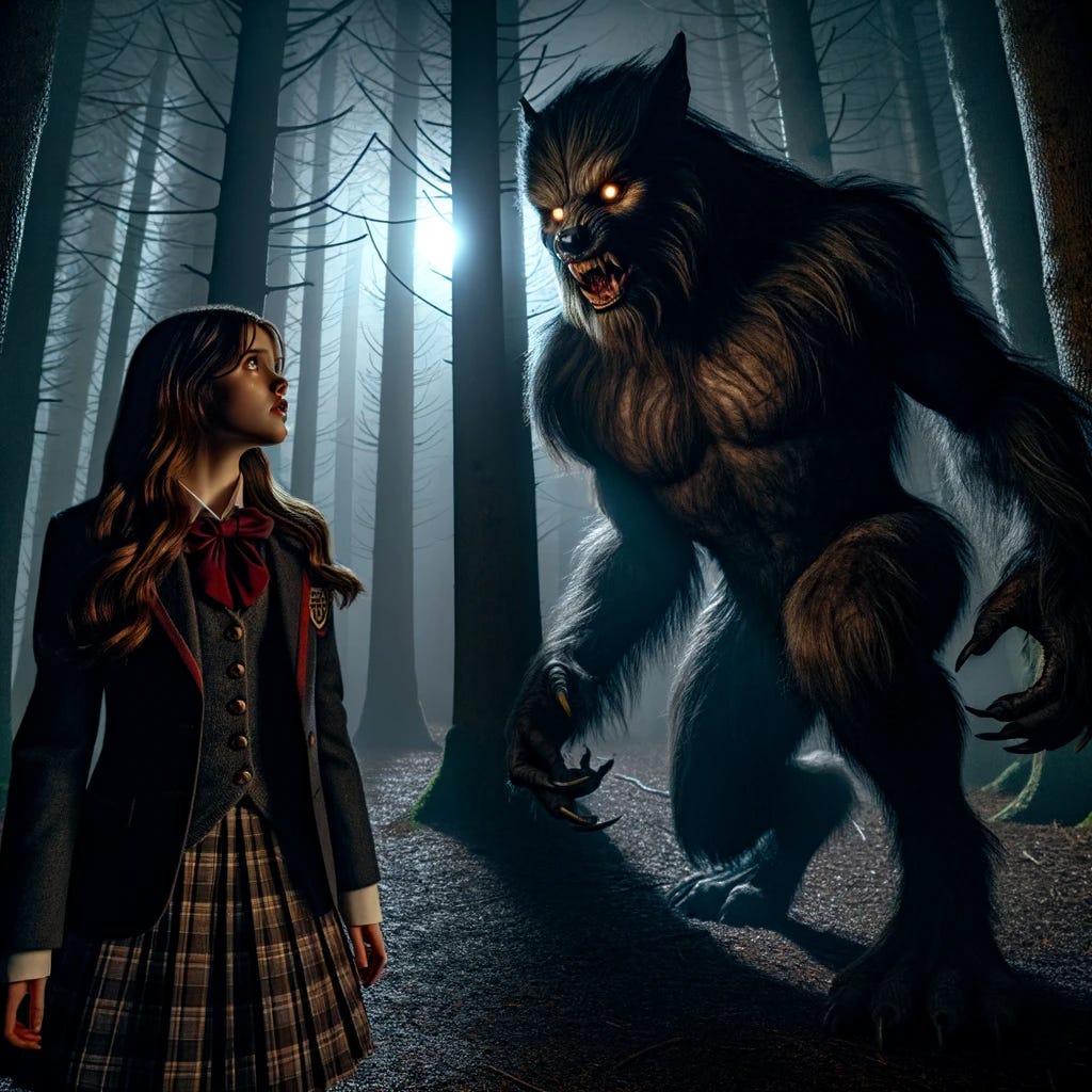 Linda lay asleep in bed, and then her eyes opened wide. Her eyes turned blue to yellow as she transformed from human to beast. The transformation was violent and profound, and her body wracked with a raw, primal force that reshaped her very being.  Her bones cracked and reformed, her skin sprouting a thick coat of fur as she transitioned from a boarding school student to a creature of legend â a werewolf.